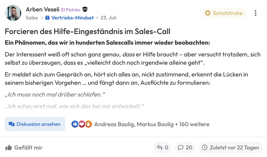 Verbessere deine Sales-Skills – übe deine Skripte, Pitches und Einwandbehandlung mit anderen aktiven Mitgliedern aus der Community.