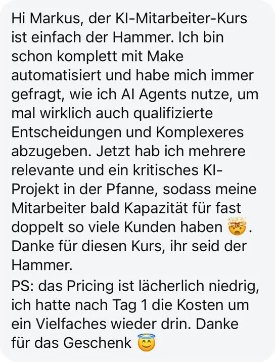 “Das Online-Training KI-Mitarbeiter für Coaches und Berater von Baulig Consulting zeigt auf einfache und praxisnahe Weise, wie KI-Automationen erfolgreich ins eigene Unternehmen integriert werden können.”